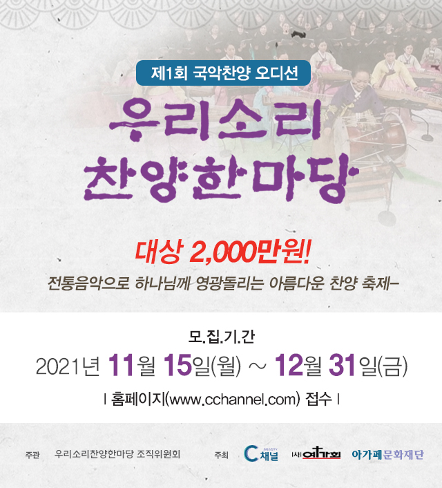1. 전통국악찬양 부문: 순수 전통 국악(판소리, 민요, 국악기)으로 참여